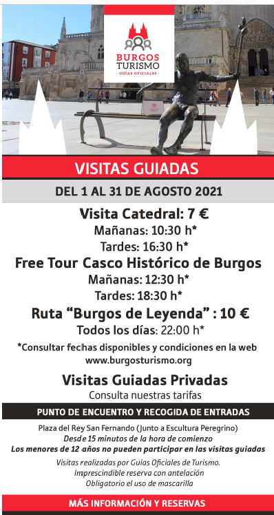 Para participar, deben reservar con antelación a través de la web www.burgosturismo.org según se indica en la información ya que, debido a los eventos previstos en la ciudad ( VIII Centenario, Vueltas Ciclistas, etc…) puede ser que los horarios de visita se vean modificados por cambios en los horarios de la catedral, etc.. Además, las plazas son limitadas por la normativa COVID .