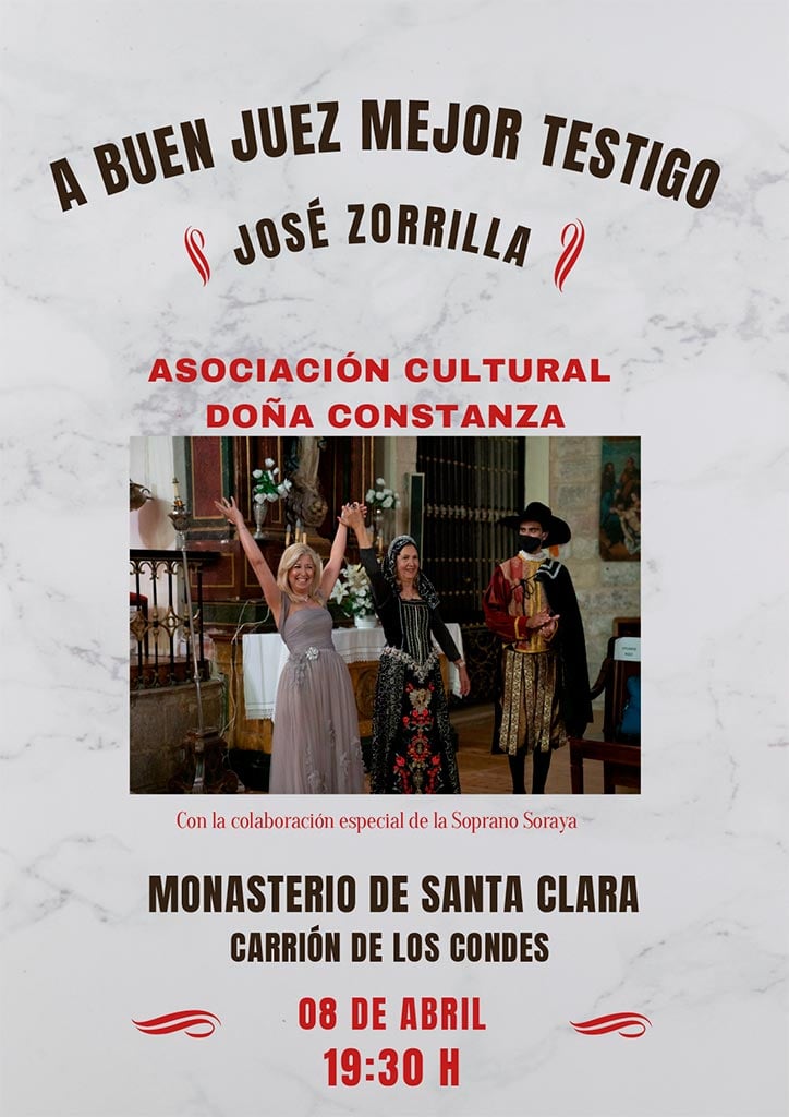 La Asociación Cultural Doña Constanza, con la colaboración especial de la Soprano Soraya, representará, el viernes 8 de abril a las 19:30 horas, en el Monasterio de Santa Clara de Carrión de los Condes, “A buen juez mejor testigo” de José Zorrilla, basada en la leyenda del Cristo de la Vega de Toledo.