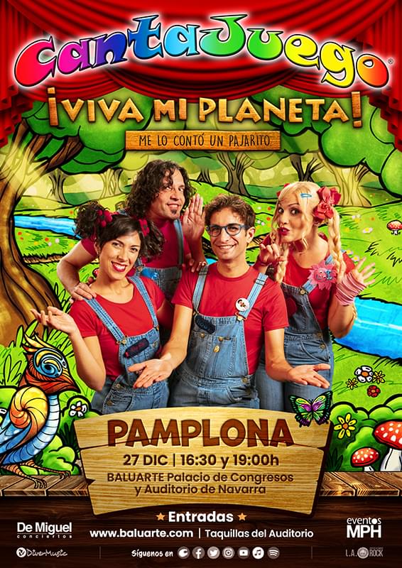 CantaJuego presenta para su gira 2023/2024 ¡VIVA MI PLANETA! Me lo contó un pajarito, una original historia que transportará al público a la libertad de la que gozan los pájaros. Con su experiencia, los amigos Cantajuegos ayudarán en Baluarte a realizar grandes aprendizajes siempre con la música, coreografías y el humor de los reconocidos personajes Coco, Pepe y Buby.