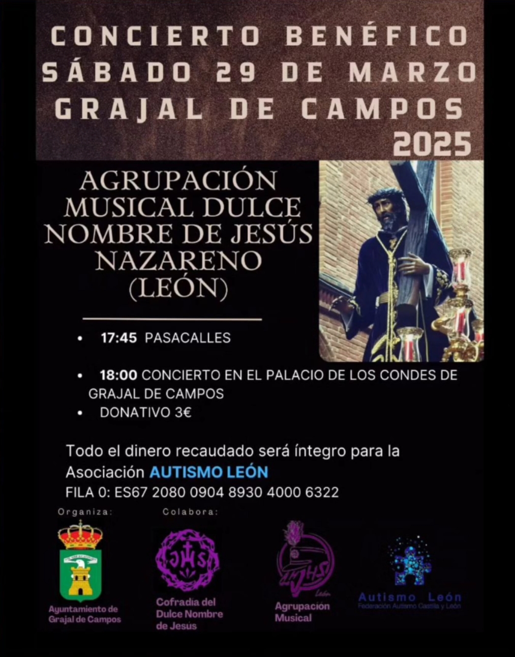 El sábado, 29 de marzo, la localidad de Grajal de Campos se convertirá en escenario de un evento musical con fines solidarios. La Agrupación Musical Dulce Nombre de Jesús Nazareno de León ofrecerá un concierto benéfico a favor de la asociación Autismo León.