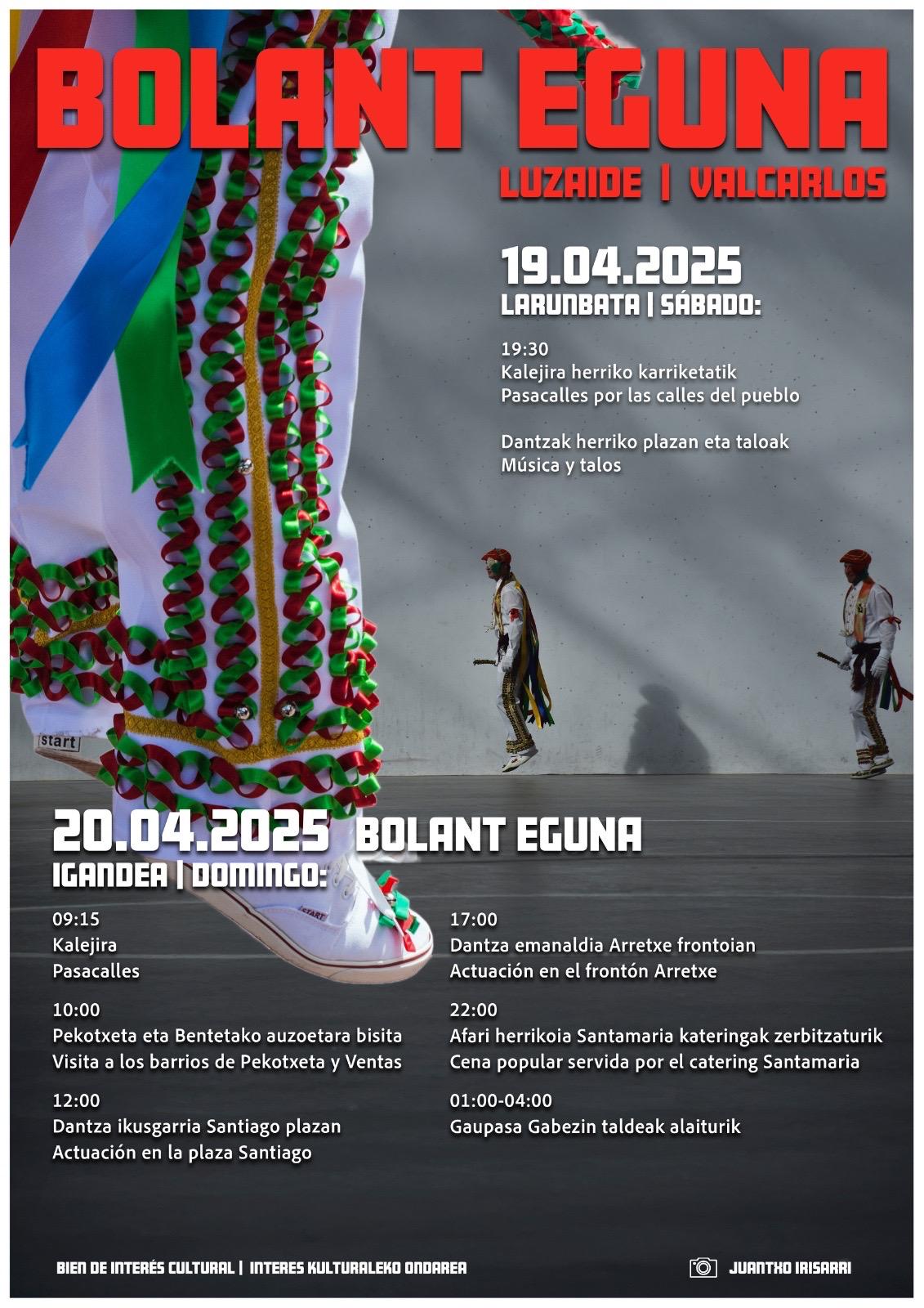 Este evento tan especial comienza el sábado , día 19 de abril por la tarde, con alegres pasacalles por las calles del pueblo y degustación de talos más tarde, por la mañana siguiente, día 20 de abril, se desarrolla el momento más emocionante, en la plaza de Santiago a las 12h y por la tarde en el frontón a partir de las 17h, será el día más especial, cuando los dantzaris hagan gala de todo su esplendor, al ritmo de sus pasos y movimientos. Los dantzaris llevan llamativas cintas de colores que cuelgan de sus espaldas, también llevan una característica boina roja y cascabeles que emiten un sonido acompasado cuando bailan.