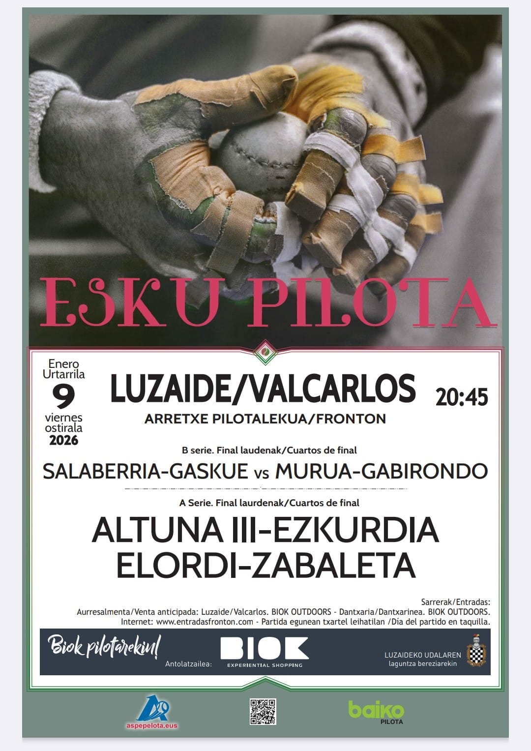 Os invitamos el día 9 de enero próximo a las 20:45 h. viernes, al evento deportivo del Partido de Pelota, que tendrá lugar en el Fronton Arretxe de Luzaide-Valcarlos. Las entradas anticipadas se podrán conseguir en los siguientes enlaces y el mismo día del partido en taquilla del Frontón.