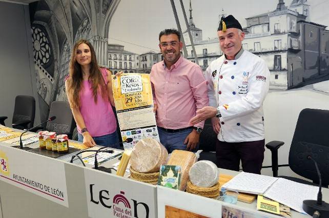 El concejal de Comercio, Consumo y Fiestas del Ayuntamiento de León, Pedro Llamas; el maestro cortador de queso Jose López, del Grupo Palenzuela, y Alexia López, de Mieles Urzapa, han presentado hoy este encuentro.