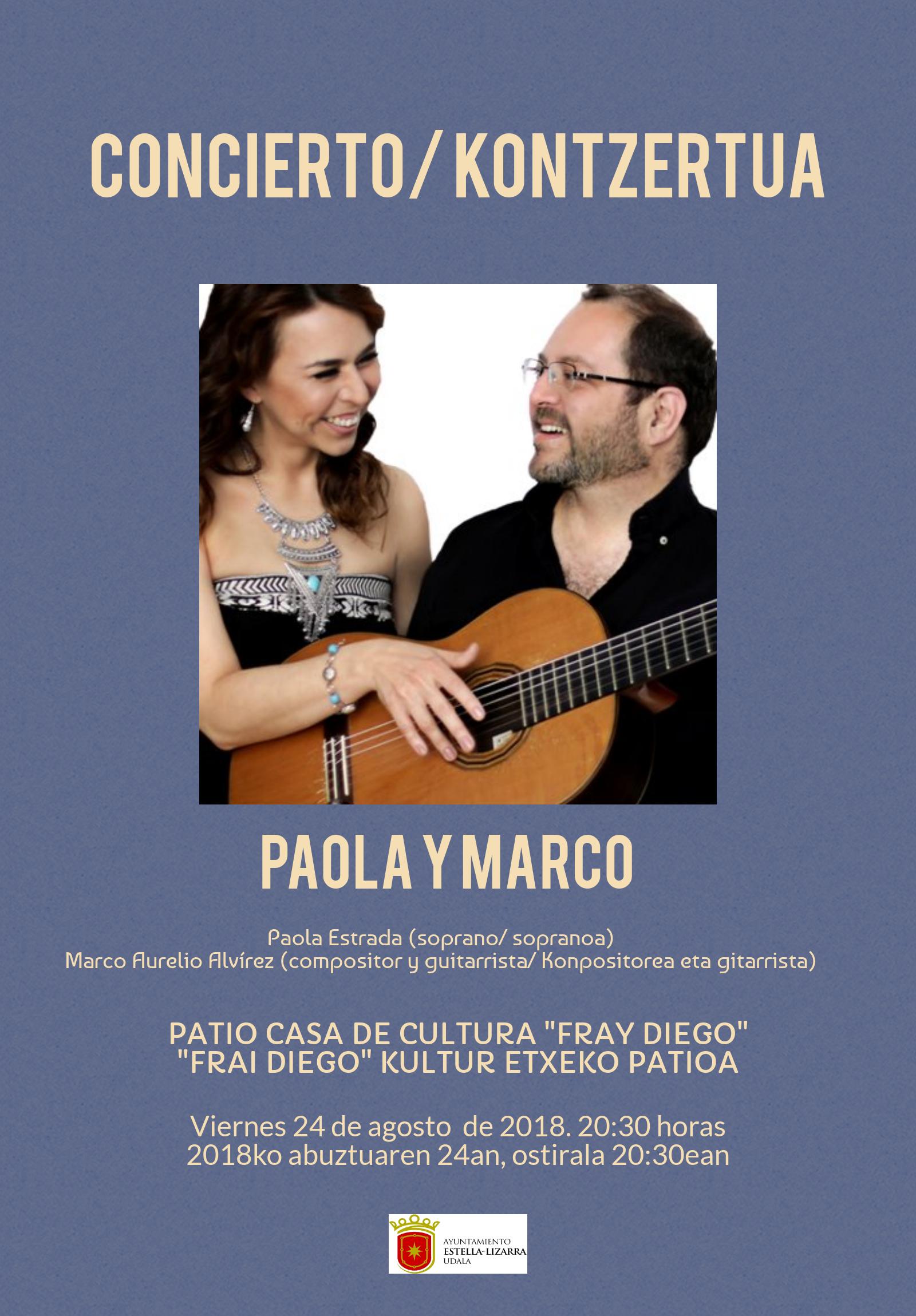 Gozatu Paola Estradarekin (sopranoa) eta Marco Aureliorekin (konpositorea eta gitarrista) inguru paregabe batean, Estella-Lizarrako “Frai Diego” Kultur Etxeko patioa.