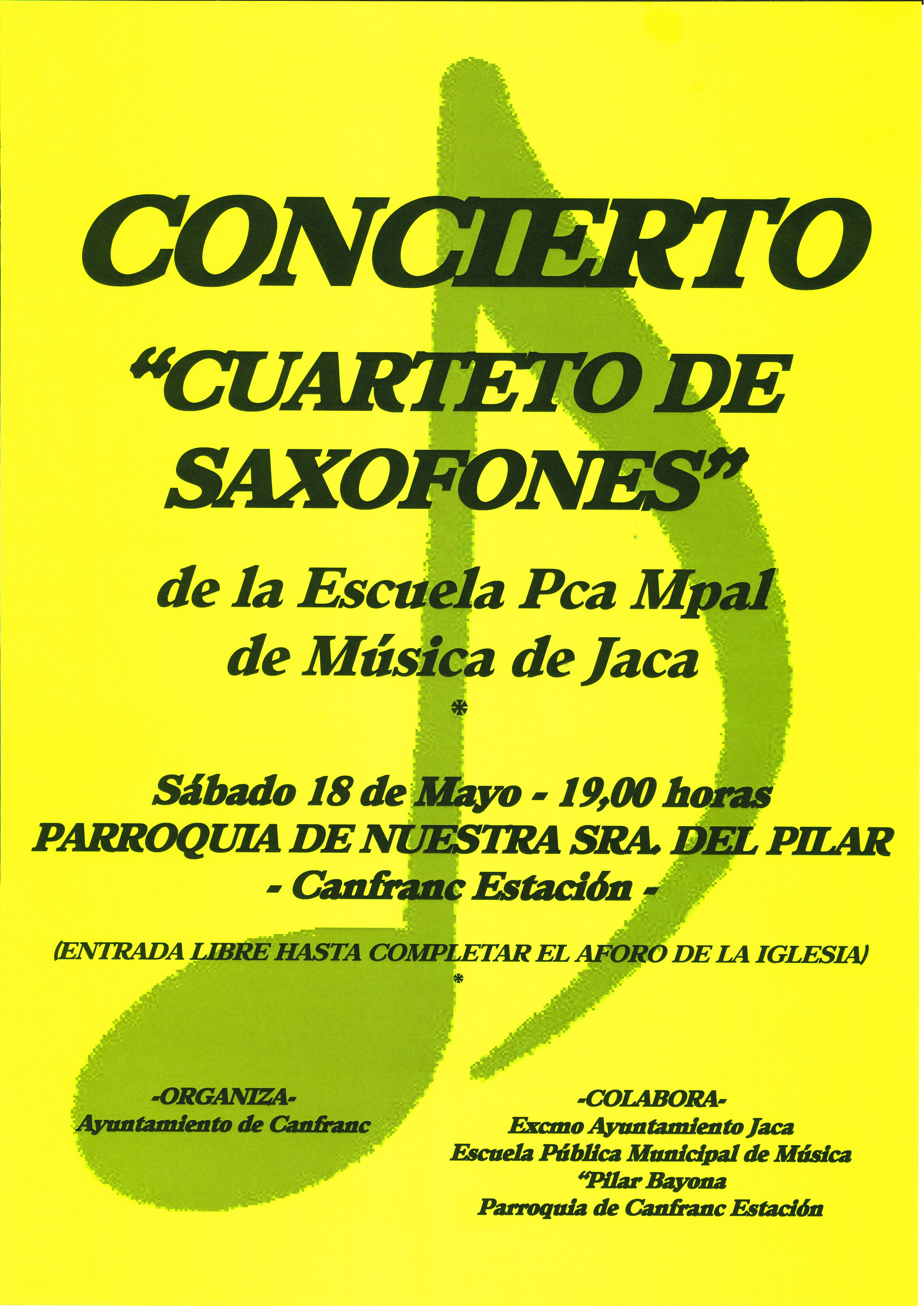 Sábado 18 de mayo a las 19:00h. en la Iglesia Parroquiela «Nuestra Sra. del Pilar» de Canfranc Estación , concierto » CUARTETO DE SAXOFONES» de la Escuela Pública Municipal de Música «Pilar Bayona» de Jaca.