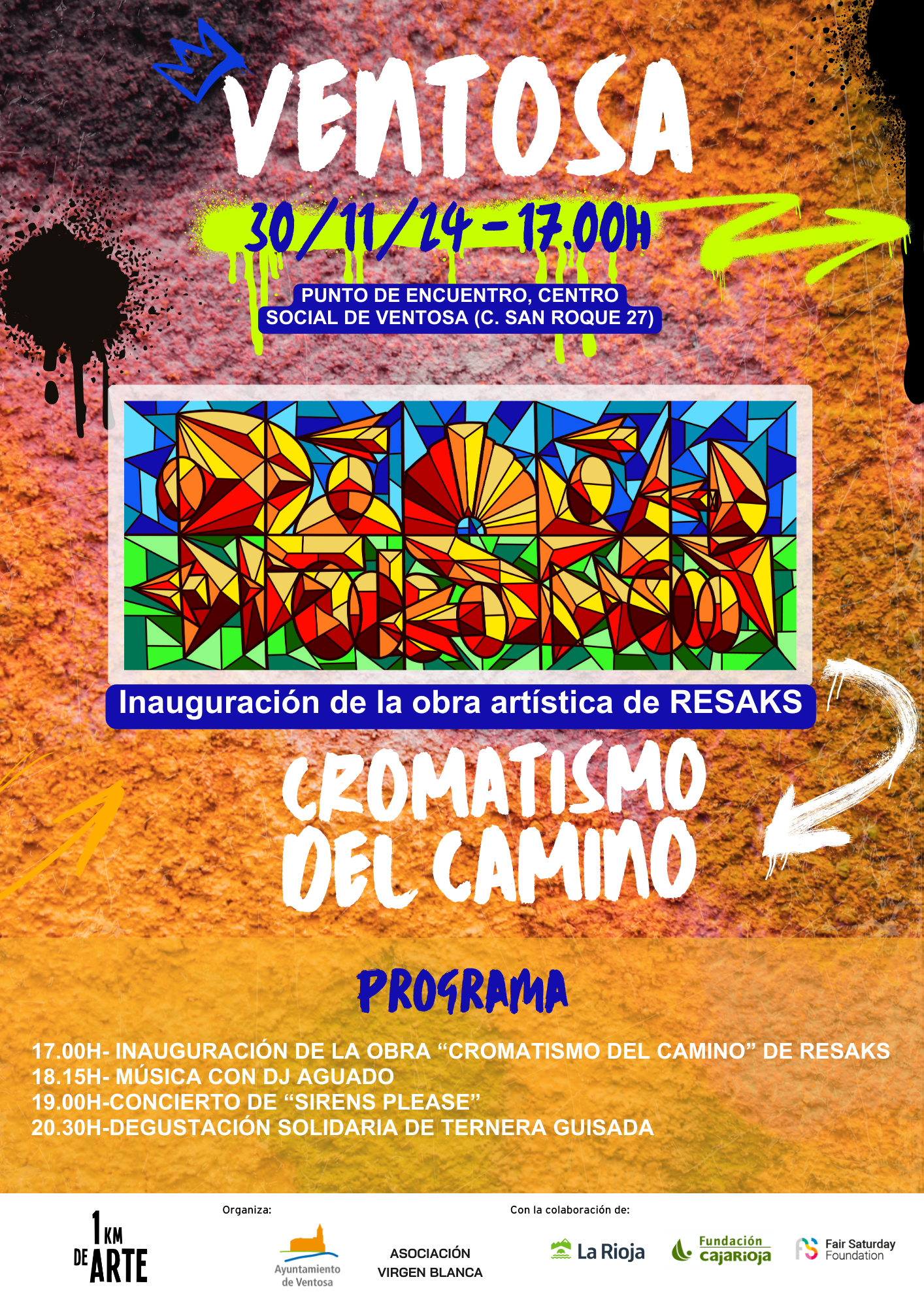 El próximo día 30 de noviembre, tendrá lugar la presentación de la obra: «Cromatismo del Camino», de RESAKS, a partir de las 17.00h en el Centro Social de Ventosa como parte de 1Km de Arte.