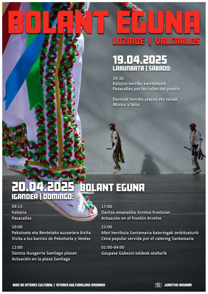 Este evento tan especial comienza el sábado , día 19 de abril por la tarde, con alegres pasacalles por las calles del pueblo y degustación de talos más tarde, por la mañana siguiente, día 20 de abril, se desarrolla el momento más emocionante, en la plaza de Santiago a las 12h y por la tarde en el frontón a partir de las 17h, será el día más especial, cuando los dantzaris hagan gala de todo su esplendor, al ritmo de sus pasos y movimientos. Los dantzaris llevan llamativas cintas de colores que cuelgan de sus espaldas, también llevan una característica boina roja y cascabeles que emiten un sonido acompasado cuando bailan.