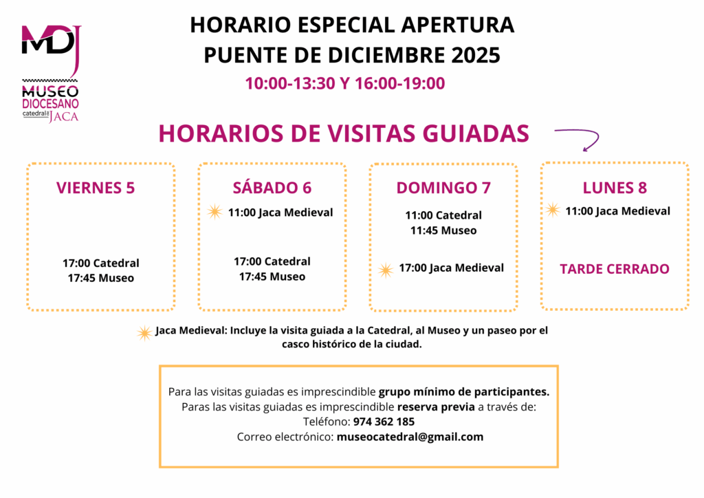 5diciembre JacaHORARIO ESPECIAL PUENTE DE DICIEMBRE 2025 MUSEO DIOCESANO JACADel 5 diciembre al 8 diciembre, 2025Web Oficial del evento