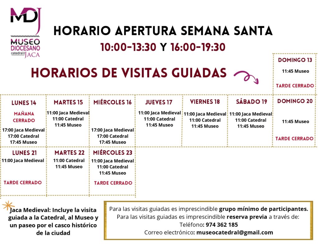 14abril JacaHorario Semana Santa Museo Diocesano de JacaDel 14 abril al 23 abril, 2025Web Oficial del evento Esta Semana Santa disfruta del Museo Diocesano de Jaca, con este horario del 14 al 23 de abril Horario Semana Santa 2025