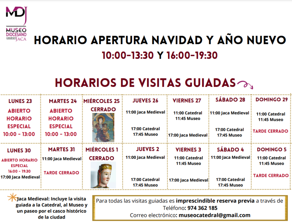 23diciembre JacaHorarios de navidad del Museo Diocesano de JacaDel 23 diciembre al 5 enero, 2025Web Oficial del evento Se muestran los horarios de apertura y visitas guiadas para las semanas de Navidad y Año Nuevo en el Museo Diocesano de Jaca.Horario Navidad 2024