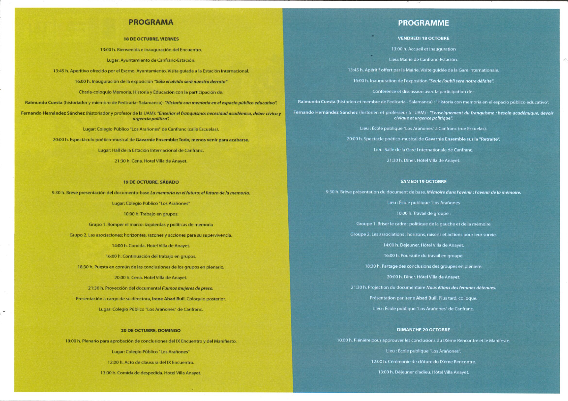 Interesantes conferencias  el sábado y domingo a la mañana en la Sala Polivalente de las Escuelas de Canfranc. En este mismo edificio, se podrá visitar también, la exposición «Solo el olvido será nuestra derrota» que se inagurará el viernes a las 16h00 y además el sábado a las 21h30 proyección  del documental «Fuimos  mujeres de preso» de Irene Abad Buil.