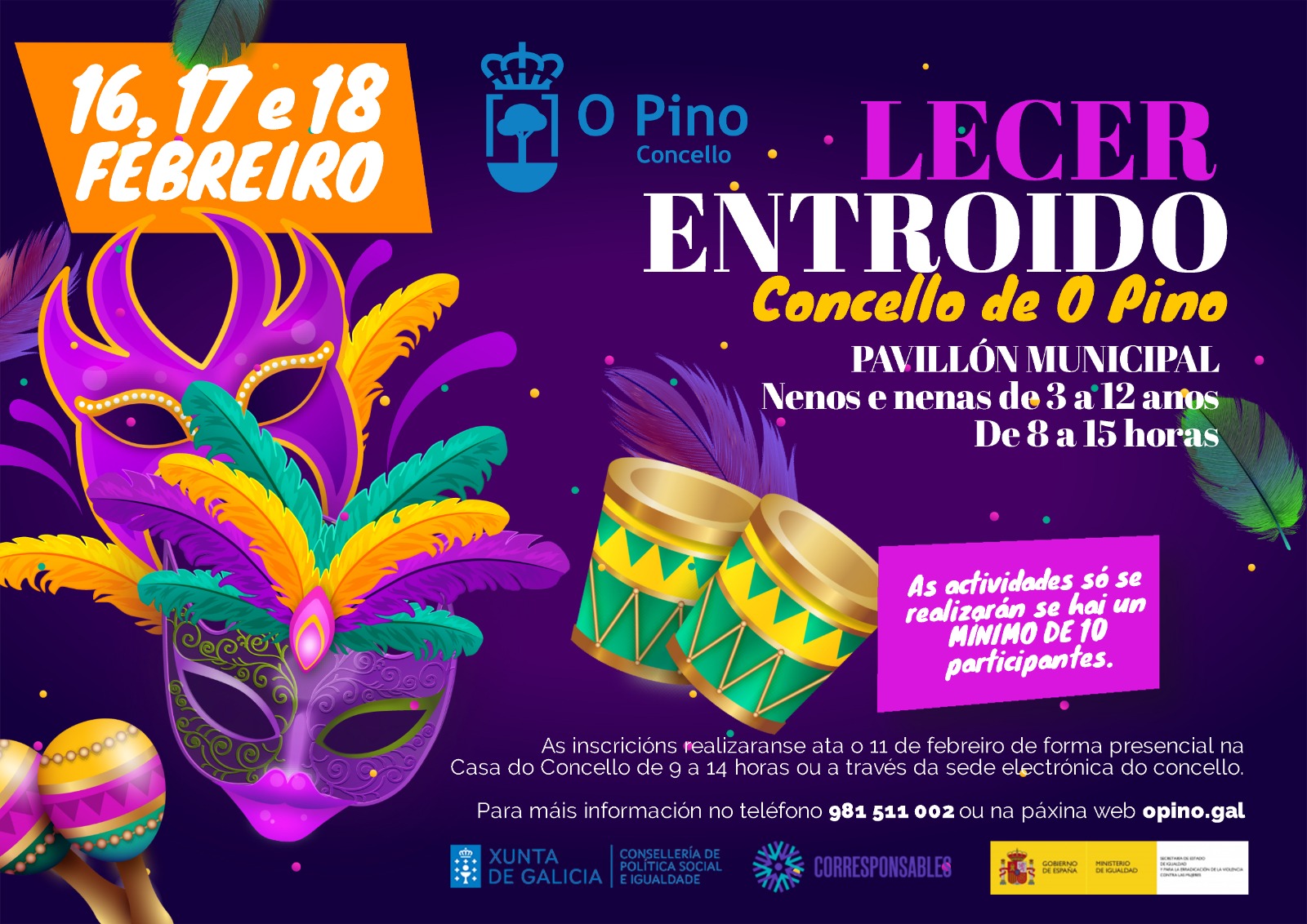 O Pino. 20-1-2026.- O Concello do Pino, a través da Concellería de Muller e Benestar Social, pon en marcha unha nova edición do programa Concilia Entroido 2026, unha iniciativa dirixida a apoiar ás familias do municipio na conciliación da vida laboral e familiar durante o período de vacacións escolares.