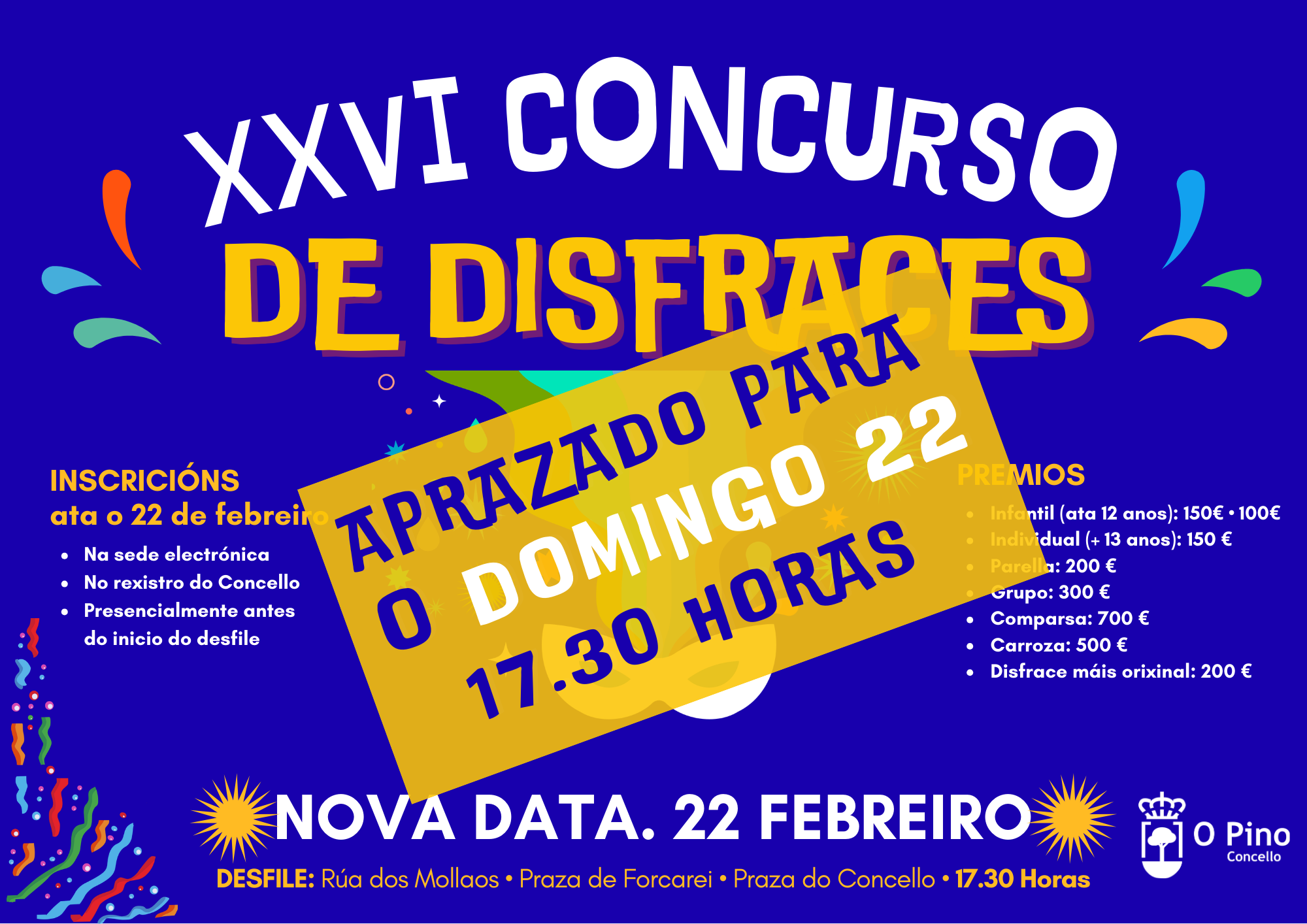 O prazo de inscrición permanecerá aberto ata o propio día 22 de febreiro de 2026. As solicitudes poderán presentarse a través da sede electrónica municipal; presencialmente no Rexistro do Concello do Pino; e tamén o mesmo día do evento, entre as 16.00 e as 17.00 horas, antes do inicio do desfile.