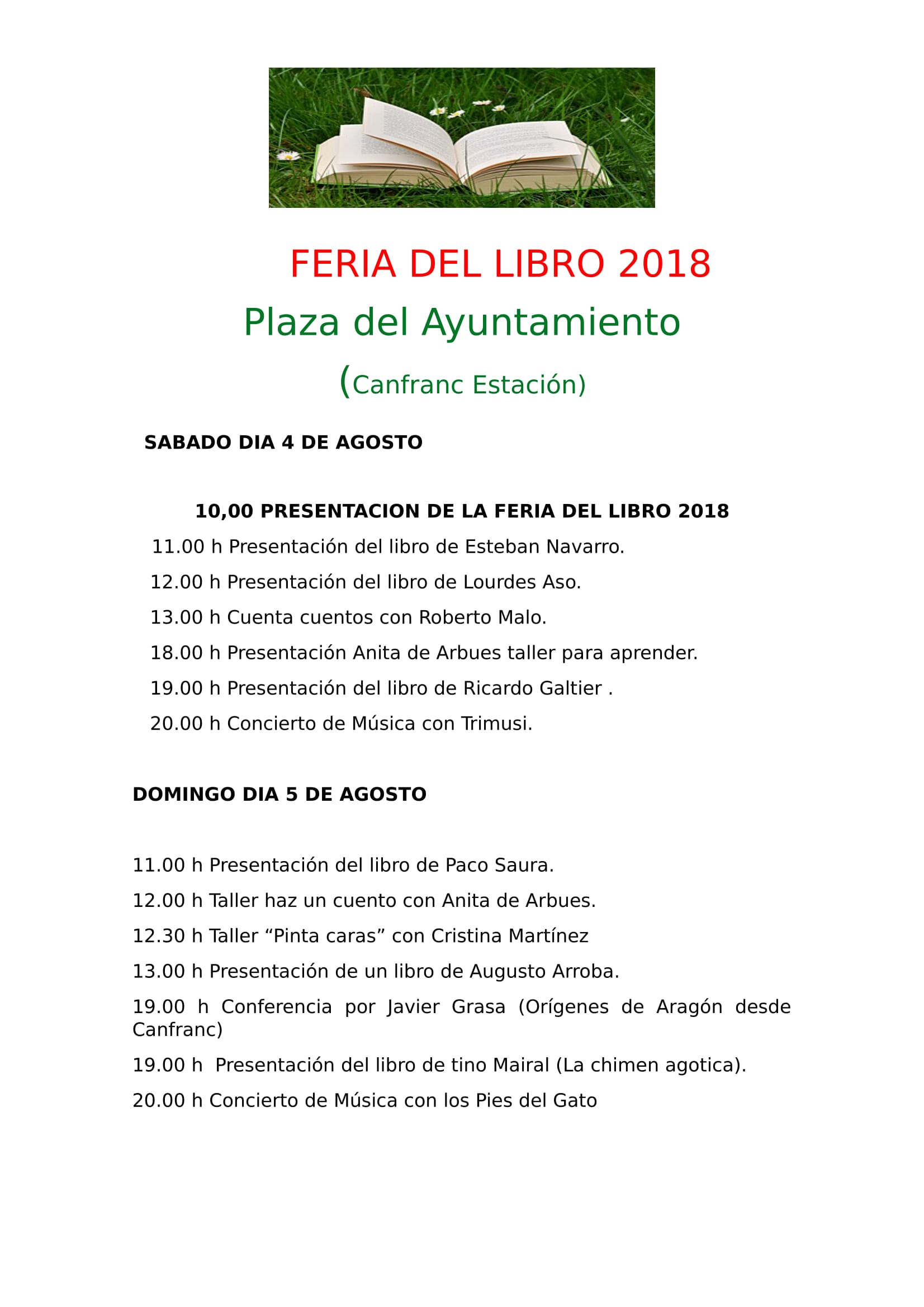 Sábado 4 y domingo 5 de agosto,Canfranc celebra su VII Feria del Libro.En la plaza del Ayuntamiento. Actividades y propuestas literarias para todos los públicos.Consulta el programa adjunto.