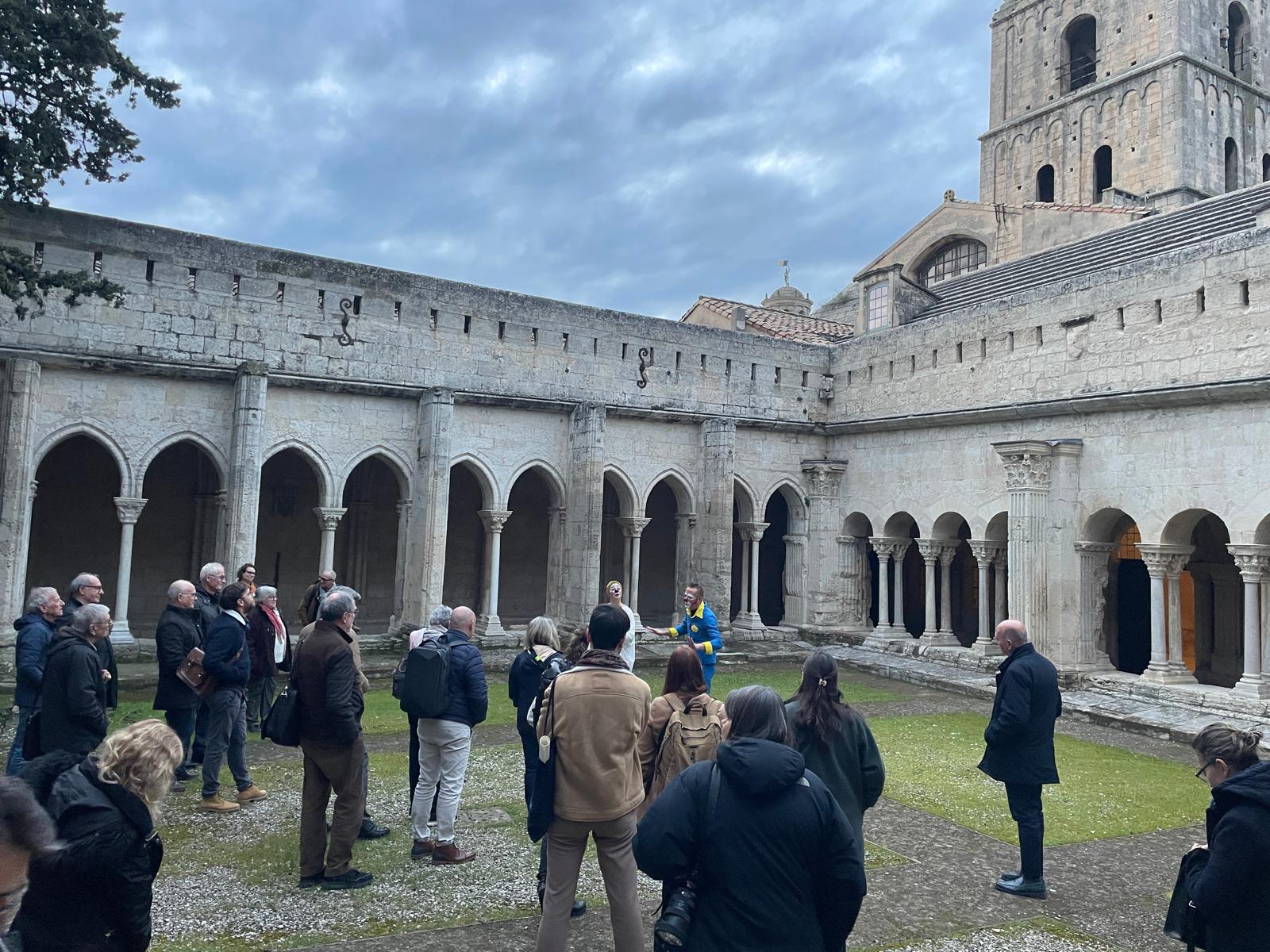 Para finalizar la jornada de trabajo, el congreso culminó con un cóctel y una visita guiada al claustro de Saint Trophime, una de las joyas patrimoniales de Arlés, ciudad que se beneficia de una doble inscripción en la Lista del Patrimonio Mundial de la UNESCO, para los bienes culturales de Arlés, «los monumentos romanos y romanos» y para los bienes culturales en serie «Chemins de Saint-Jacques de Compostelle en Francia».