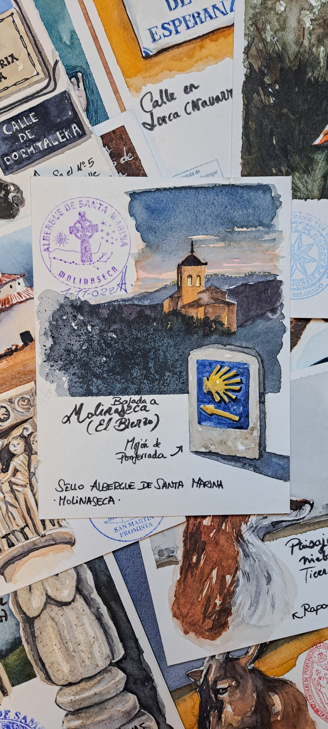 En 2022, Isis Roldán Simal se aventuró a realizar el Camino de Santiago Francés, desde Saint Jean hasta Muxia. En su mochila un buen taco de papel de pequeño formato, apto para pintar acuarelas, muchas ideas y un propósito: conseguir sellar cada retazo de papel en una localidad y tomar los apuntes necesarios para, posteriormente, plasmar un recuerdo y trazar así su propio y particular “libro de viaje”.