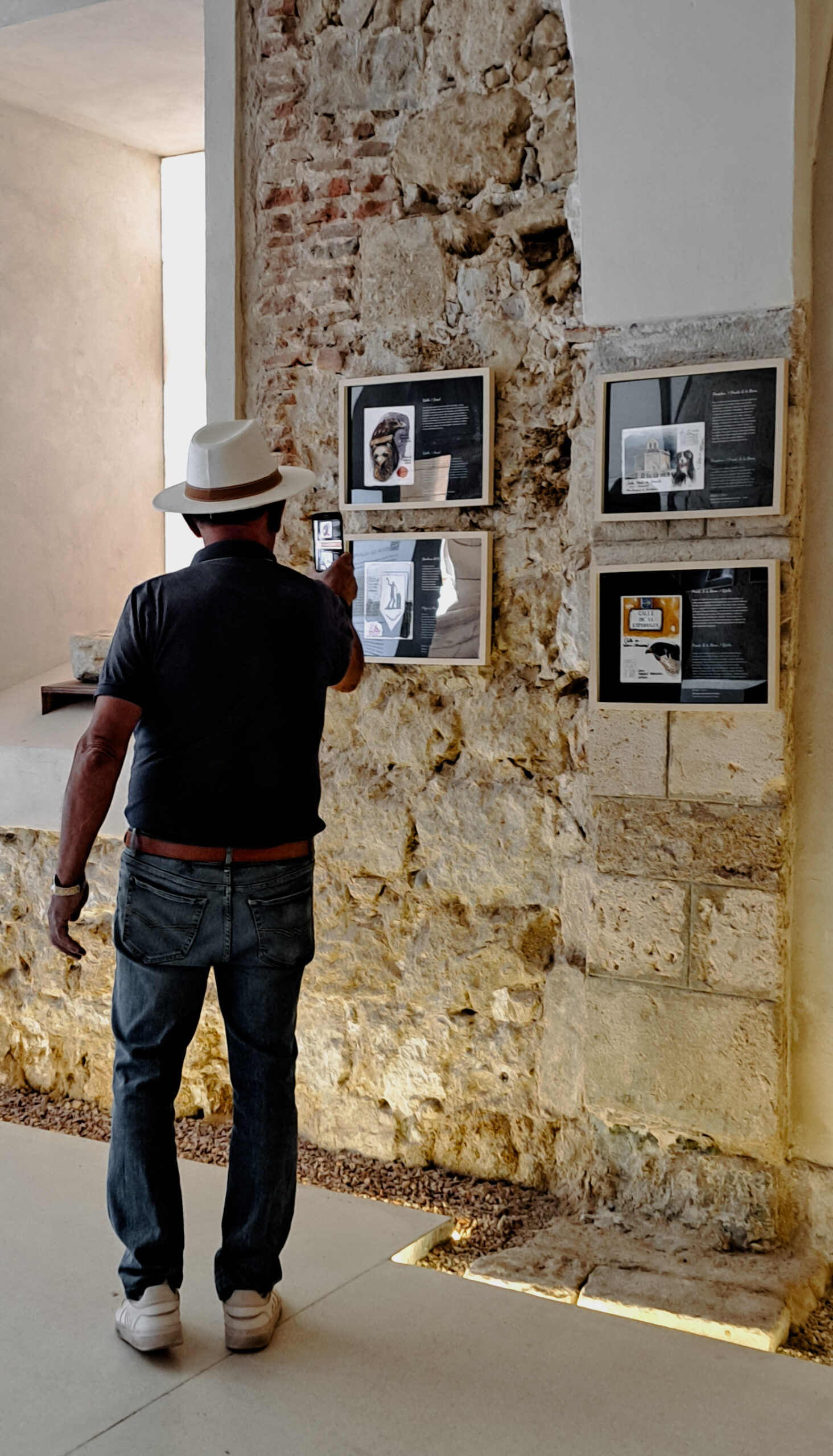 En este peculiar trazado, la iglesia de planta octogonal de Torres del Río, un capitel de San Martín de Frómista, un detalle del mensario pintado en San Isidoro de León, la inconfundible San María de Eunate o el Faro de Finisterre, en la costa da Morte, comparten espacio con señales, miliarios, peregrinos, viñedos y un sinfín de animales: gallo, toro, oca, zorro, perro y, cómo no, el halcón peregrino que recorre, sobrevuela y ampara toda la exposición.