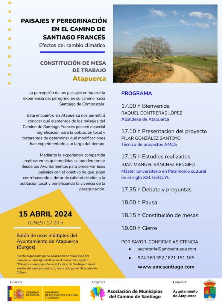La mesa de trabajo en Atapuerca, que organizamos en el marco del proyecto “Paisajes y peregrinación en el Camino de Santiago francés: Efectos del cambio climático”, financiado por el Ministerio de Cultura, nos permitirá conocer qué elementos de los paisajes del Camino de Santiago Francés poseen especial significación para la población local. Además trataremos de determinar qué modificaciones han experimentado a lo largo del tiempo. Mediante la experiencia compartida exploraremos qué medidas se pueden tomar desde los Ayuntamientos para preservar esos paisajes para que sigan contribuyendo a dotar de calidad de vida a la población local y beneficiando la vivencia de la peregrinación.