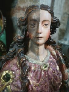 El siguiente paso consistió en la retirada de los elementos ajenos al altar (cableado eléctrico, clavos, alambres, etc.). La fijación puntual de las numerosas zonas en riesgo de desprendimiento en la policromía, carnaciones y dorados se llevó a cabo mediante empapelado con adhesivo orgánico, presión y calor moderado. Los test de solubilidad, catas de limpieza y la toma de muestras para su análisis químico, determinó la estrategia a seguir durante las labores de limpieza mecánico-química. Se han retirado los depósitos de suciedad superficial como polvo o escurridos de cera o aceite así como las capas oxidadas de barnices o repintes mediante “solvent gel” y mezclas de soluciones acuosas y emulsiones, controlando los parámetros de conductividad y PH.