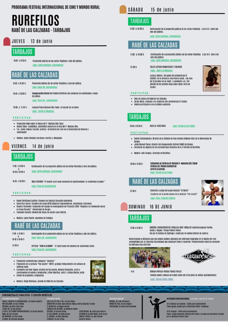 La II Edición de RURÉFILOS se celebrará del 13 al 16 de junio de manera compartida en las localidades burgalesas de Tardajos y Rabé de las Calzadas. Además de la exhibición de los cortometrajes finalistas, el festival contará con variadas actividades paralelas cuya programación se difundirá próximamente.