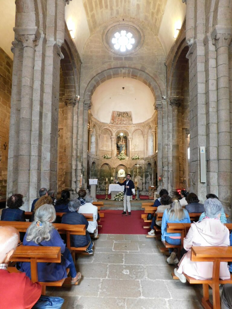 El momento central de la jornada fue la conferencia «Románico en digital: Santa María de Sar en el siglo XIII», a cargo de Victoriano Nodar Fernández, doctor en Historia del Arte por la Universidade de Santiago de Compostela y profesor de la Universidade de Vigo. El especialista comenzó su exposición en el interior del templo, donde guio a los asistentes por los elementos arquitectónicos que evidencian las transformaciones sufridas desde la Edad Media: la sustitución de la cubierta original de madera por bóvedas más pesadas, la incorporación de arbotantes en el siglo XVIII para evitar el colapso de la estructura o la alteración de la fisonomía original de la fachada oeste.