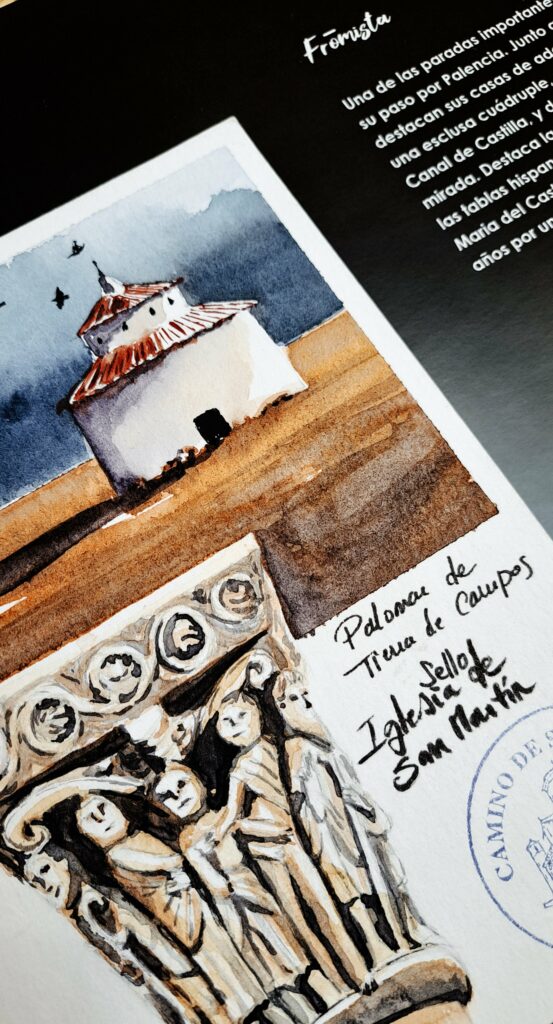 “Halcón Peregrina” recoge lugares icónicos del Camino como la iglesia de planta octogonal de Torres del Río, el capitel de San Martín de Frómista, el mensario pintado en San Isidoro de León o la iglesia de Santa María de Eunate, entre otros. Además, incluye escenas cotidianas, peregrinos, señales, animales y objetos que marcaron el recorrido personal de la autora.