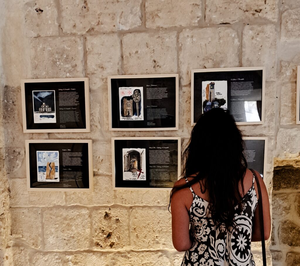 “El título es femenino, ‘Peregrina’, porque quise reflejar mi experiencia como mujer en el Camino, y que además fuera fácil de recordar para el espectador”, explica la artista. Cada acuarela está acompañada de breves textos en castellano e inglés, que ayudan a contextualizar las obras y compartir su proceso creativo.