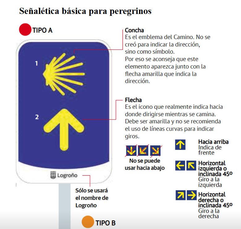 El diseño. El tamaño, proporción y color de las flechas y de los elementos distintivos del Camino de Santiago y de las rutas Eurovelo deberá ser conforme a lo establecido en los documentos ‘Directrices para la señalización del Camino de Santiago’ del Consejo Jacobeo y ‘EuroVelo BrandGuide’ de la Federación Europea de Ciclistas.