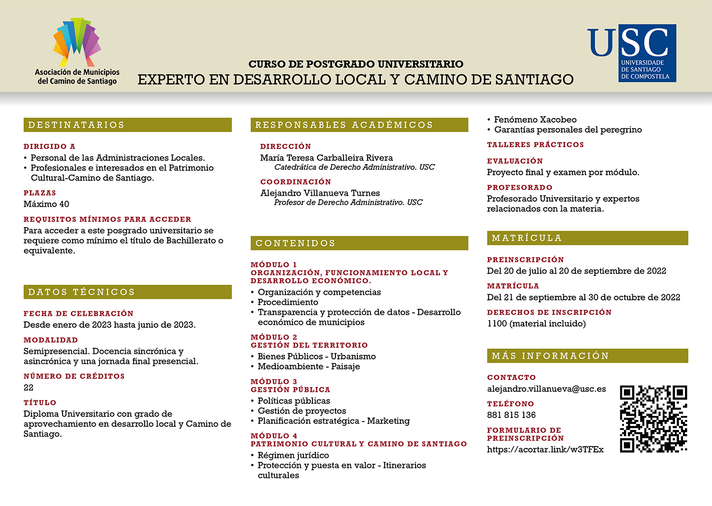 Ya está abierto el plazo de matriculación para el curso online de postgrado "Desarrollo Local y Camino de Santiago" (22 créditos) organizado por la Asociación de Municipios del Camino de Santiago y la Universidad de Santiago de Compostela. El postgrado "Desarrollo Local y Camino de Santiago"se dará en modalidad semipresencial, [...]